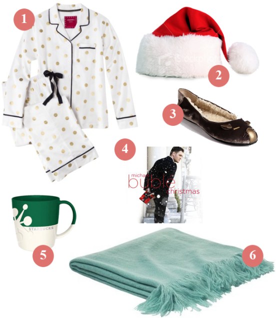 1. Polka Dot Pajamas from Target, 2. Santa hat, 3.Marc by Marc Jacobs velvet mouse slippers, 4. Christmas by Michael Buble playing as we open gifts, 5. Starbucks coffee mug, and 6. a warm throw from West Elm, $19 on sale (we have the orange one on our couch).