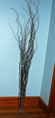 These decorative twigs were sticking straight up out of the original centerpiece, actually making it taller than my 5-foot disclaimer above. I turned them along with the tall vase into a permanent installation in an otherwise dead space in our living room.