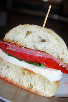 Grill ciabatta roll on a grill pan until desired crunch is reached. Pile fresh sliced tomato (lightly salt them first), mozzarella, prosciutto, and of course freshly picked basil leaves on half of the grilled ciabatta. Place other half on top…enjoy!