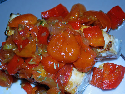 Heat 2 teaspoons olive oil in a saute pan over medium heat. Add peppers, onions and garlic and sauté until softened, 2 to 3 minutes. Add tomatoes, fish stock (or water) and wine and bring to a boil. Cook, uncovered, over high heat until thickened, about 10 minutes, stirring frequently. Stir in olives and rosemary and season with salt and pepper.
