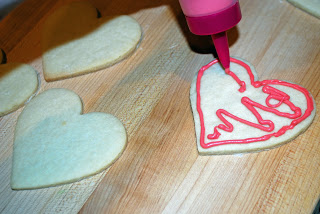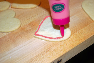 I got the idea from the Valentine’s Day episode of Martha’s show to use a squeeze bottle to apply the royal icing to each cookie. This eliminates the need for a pastry bag and makes outlining each cookies easier to ensure you get a sharp edge of icing all the way around to cookie.