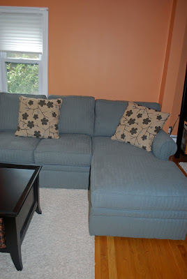 We started with the couch because we had specific needs – a smaller-than-normal sectional couch to give us more seating in the TV watching area of the room (that area isn’t big enough for a couch and love seat). We happened upon an amazing sale at Boston Interiors at the end of March where you could pick any couch design and have it made, free of charge in ANY FABRIC CHOICE from their entire fabric collection – I was in heaven. We spent a good hour deciding which color to go with and finally decided on a great micro-fiber material in an aqua/green color for the couch and a great flower pattern for the pillows that incorporated black as well as the color of the couch.