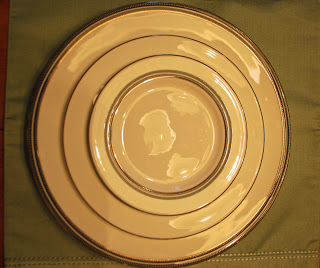 China. Ours is Union Street by kate spade. I just love the black and silver pattern and how the pattern looks when the plates are stacked on top of each other. Keeping our china pattern to black, silver, and white allows me to get different looks from time to time with brightly colored place mats and/or napkins.And now that your table is set, you can eat!