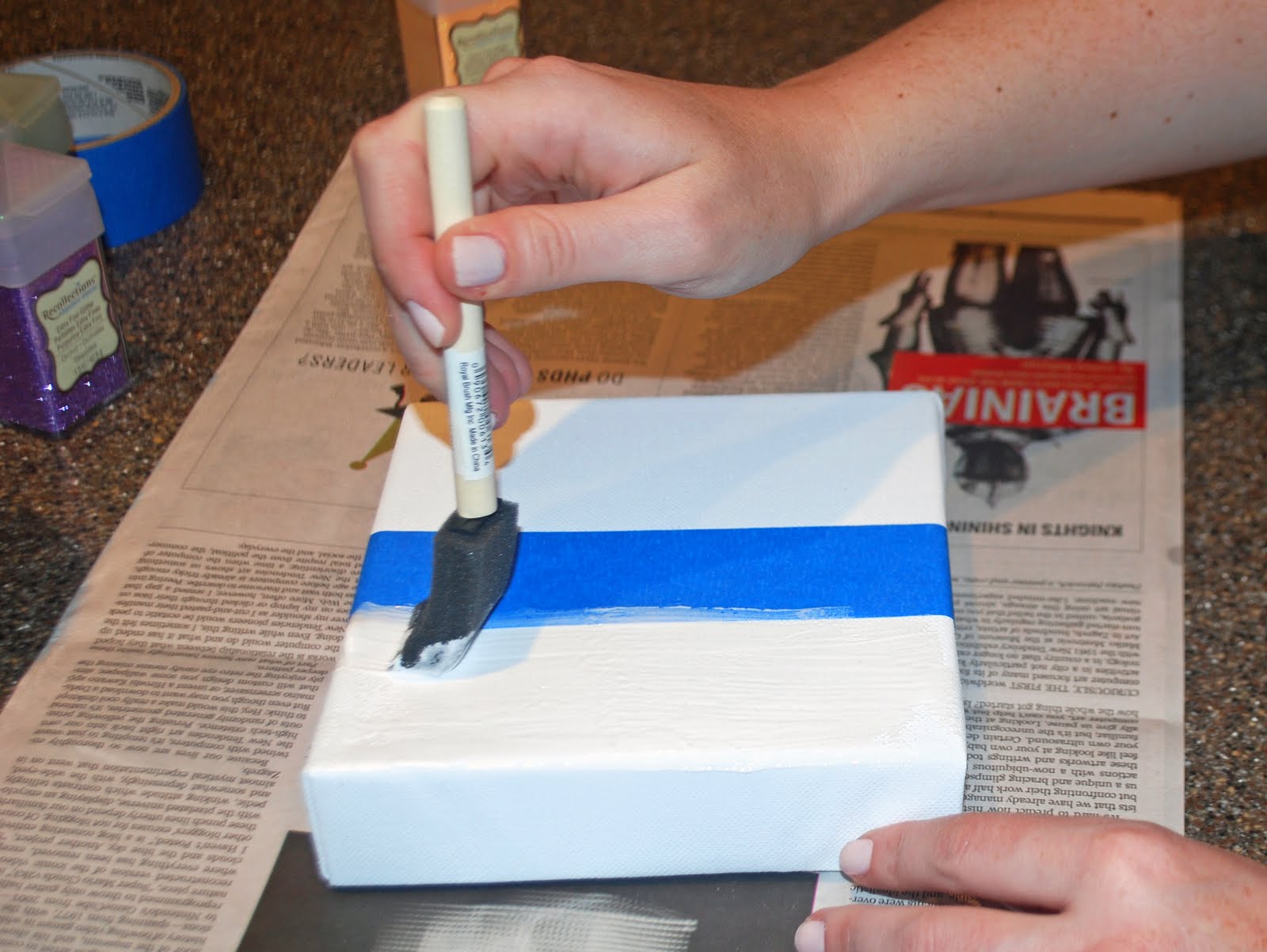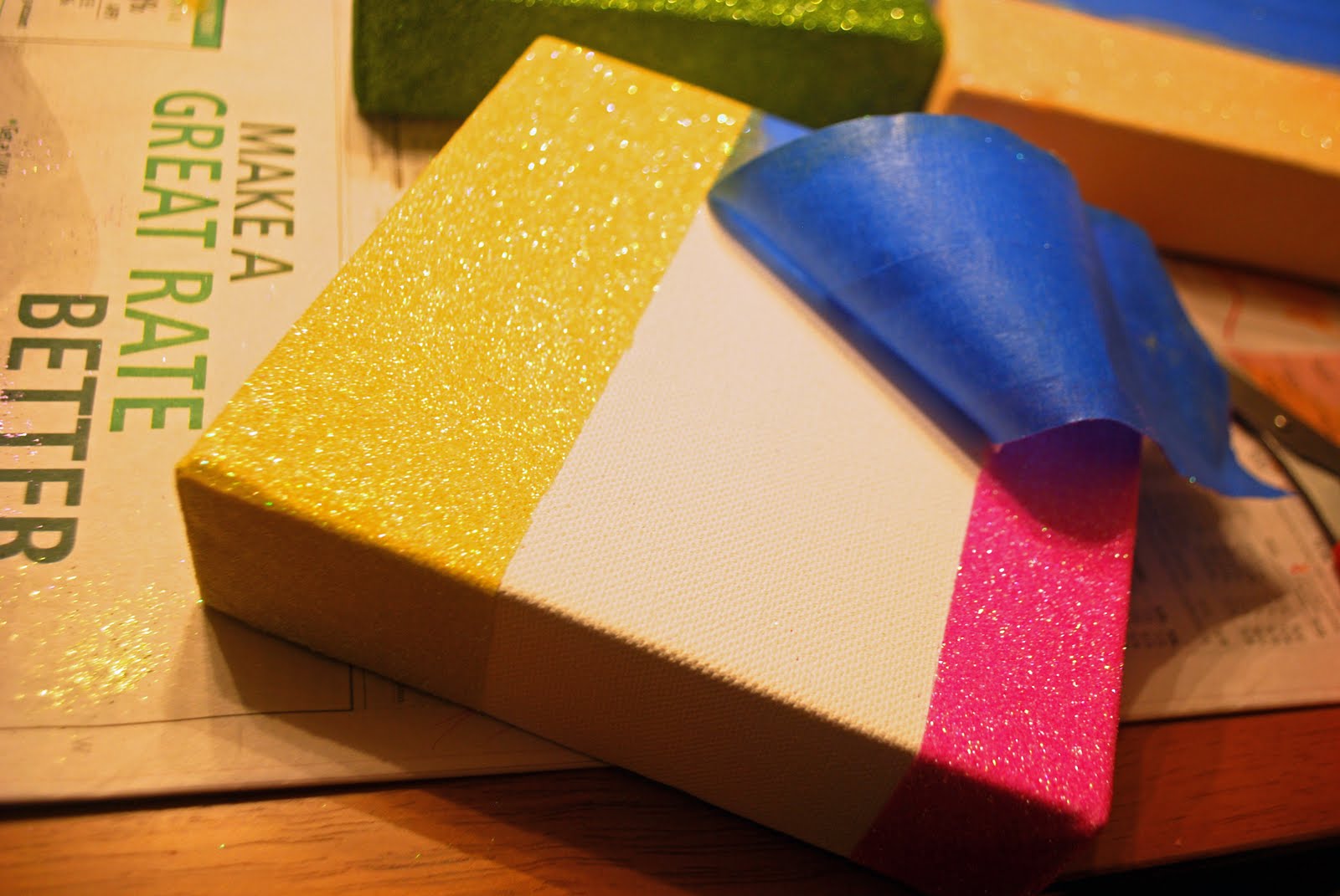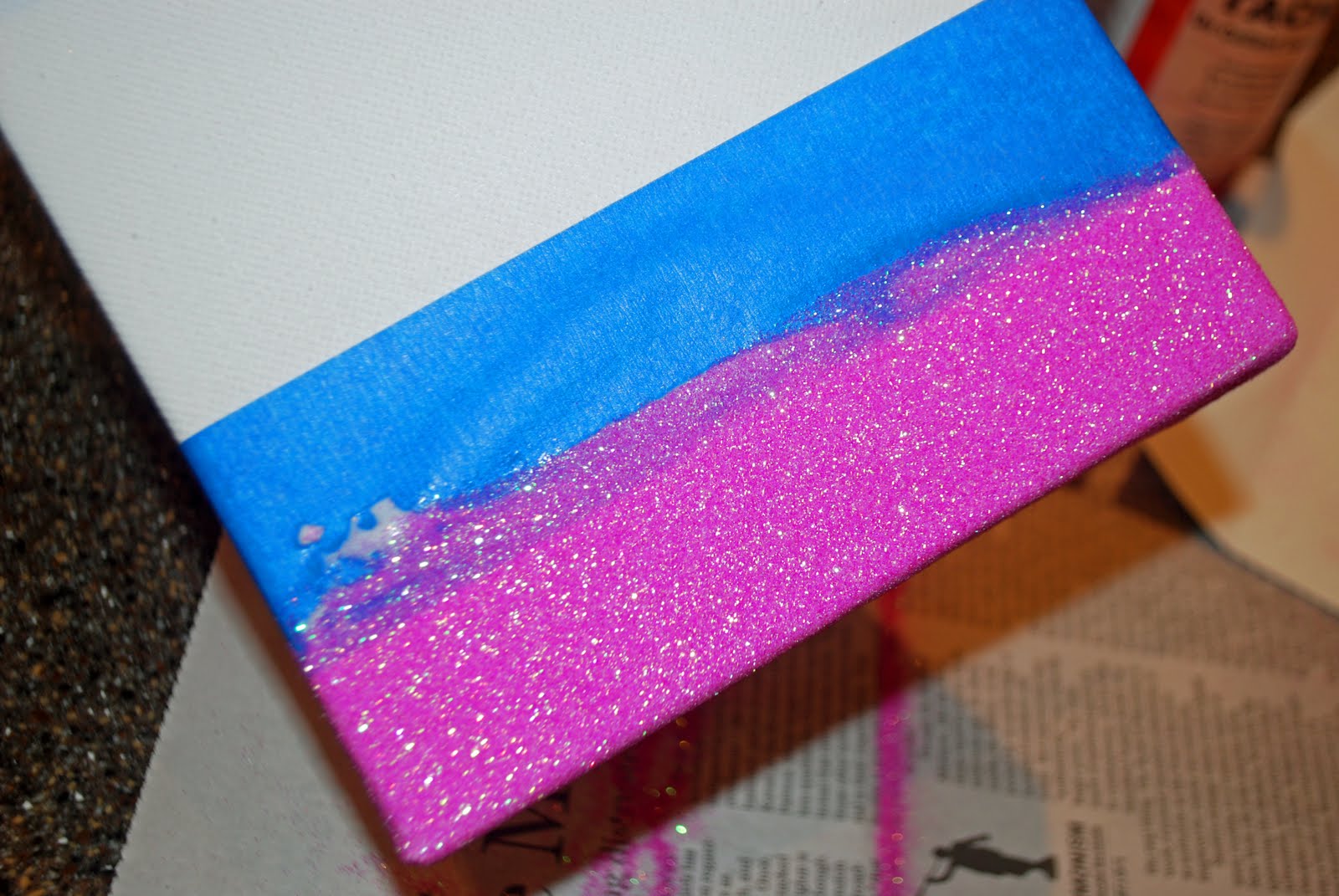 Step 2: Tape your first stripe to desired thickness. Then use your sponge brush to layer on a somewhat thick layer of tacky glue, don’t forget to glue on the perimeter of the canvas so the glitter covers all of the canvas. Sprinkle glitter over glue-y section. Let dry overnight.