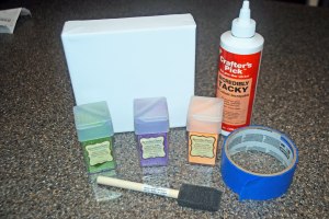 Artist canvas, Tacky Glue, Painters tape, Small sponge brush,Glitter in assorted colors, and Finishing spray – the kind used to spray on art drawn with charcoal or pastels (not pictured).