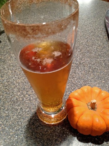 I am so pleased that I gave birth in time to have a good Pumpkin Beer this fall before the season passed. Here, I have a delicious cinnamon rimmed pint glass filled with my favorite Shipyard Pumpkinhead Beer. It’s so easy to prep your glass before you pour your beer – just combine a little fine white sugar and a dash of cinnamon. Then, moisten the rim of the glass with water and sprinkle with cinnamon/sugar mixture.