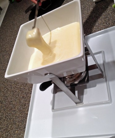 We had a block of Jarlsberg cheese that came in a great gift basket we received as a “congratulations on your baby” gift so we decided to make a traditional cheese fondue for dinner this weekend. Jarlsberg cheese is a mild, buttery, nutty, cheese from Norway, we mixed in a little Swiss cheese as well. We pulled the recipe from this great fondue recipe book we have: Fondue by Rick Rodgers. It has all sorts of traditional cheese fondue recipes as well as fried fondue (cooking ingredients in hot oil), Asian hot pot (cooking ingredients in hot broth), and of course dessert fondue! I highly recommend it for all fondue enthusiasts – you will make great use of your fondue pot!
