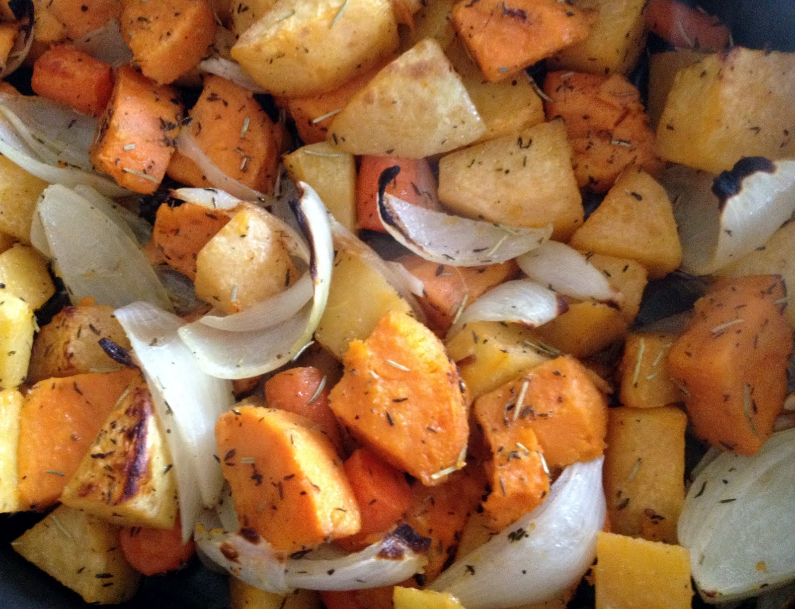 For root vegetables we use sweet potatoes, turnip, onions, carrots but really any root vegetable you like will work. Cut vegetables into 1-inch cubes. Slice onions into wedges. Coat with olive oil, herbs, and s&p. Cook at 400 degrees for 40 minutes. You may want to crank to a broil for the last 5 or 10 mins if you like them to get a little crunchy.