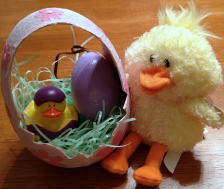 …a tiny rubber ducky Easter bath toy and her hand-painted Easter Egg on a bed of green Easter grass. The Easter Bunny also got her this great duck that quacks when it’s squeezed, but he is too big for the basket and will sit next to it.