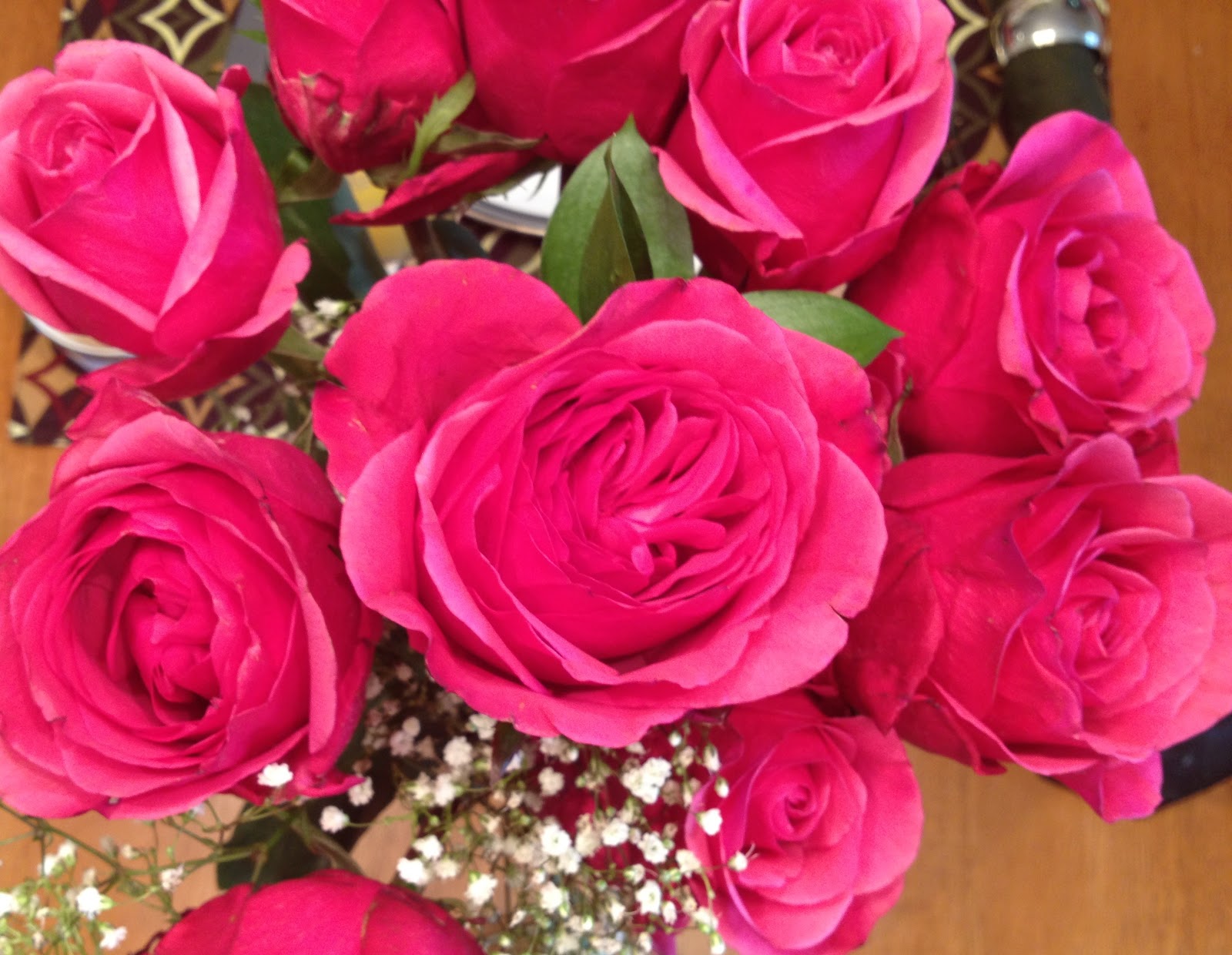 First – the table centerpiece of lovely hot pink roses, photo above!