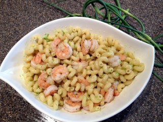 I told you last week about the first bunch of veggies we got from our CSA… well, we used the garlic scapes this weekend to make a delicious pesto served with shrimp and cellentani pasta.