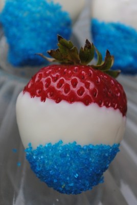 Simply dip your strawberries in the white chocolate 3/4 of the way up, leaving the top of the strawberry uncovered so red shows. Then, dip the tip of the chocolate covered strawberry into blue sugar crystals and voila…