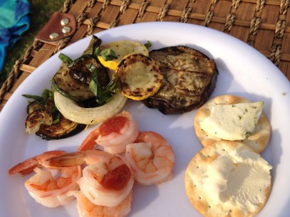 We had shrimp cocktail, grilled veggies (eggplant, onions, summer squash, zucchini, and green peppers, I know, it sound like a lot but we had so many leftover veggies from our CSA the week before!) and 2 delicious cheeses – an herb-ed goat cheese and a brie.