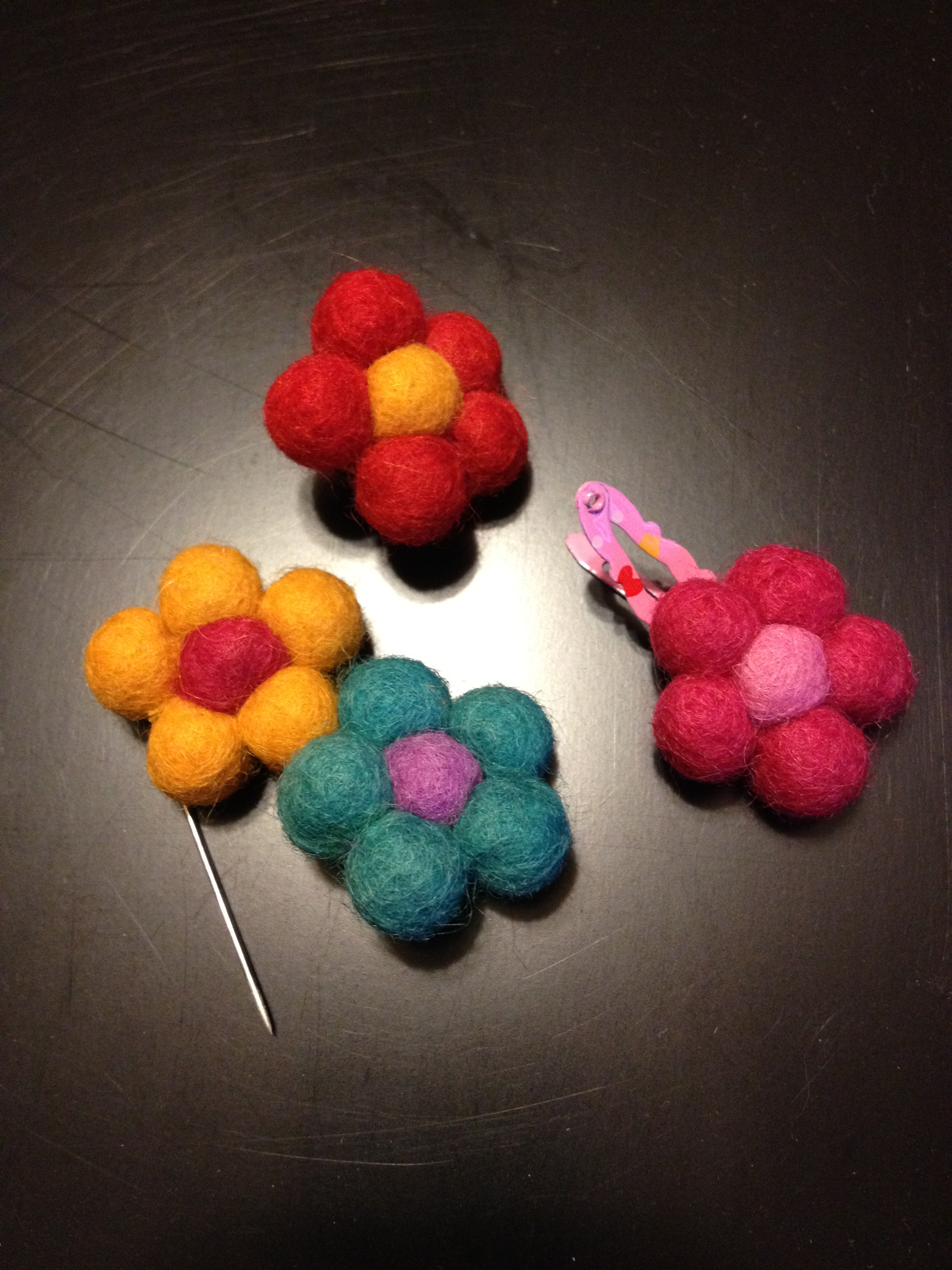 It was so easy to do, I simply sewed the felt flower to a safety pin and used tons of stitches so it’s very secure. I sewed the yellow and teal one together on a larger pin. And the pink flower is her little hair clip.
