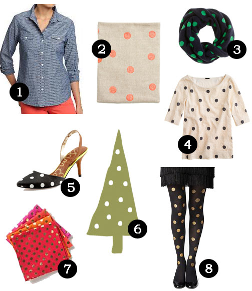 1. Chambray top from Old Navy, 2.iPad case from Madewell, 3. Polka Dot Scarf from J.Crew, 4. Polka Dot Sequin top from J.Crew, 5. Sam Edelman Slingbacks, 6. Polka Dot Christmas Tree stamp from Paper Source, 7. Anthropologie Foiled Dot Napkins, I am in LOVE with these, and 8. kate spade Gold Dot Tights.