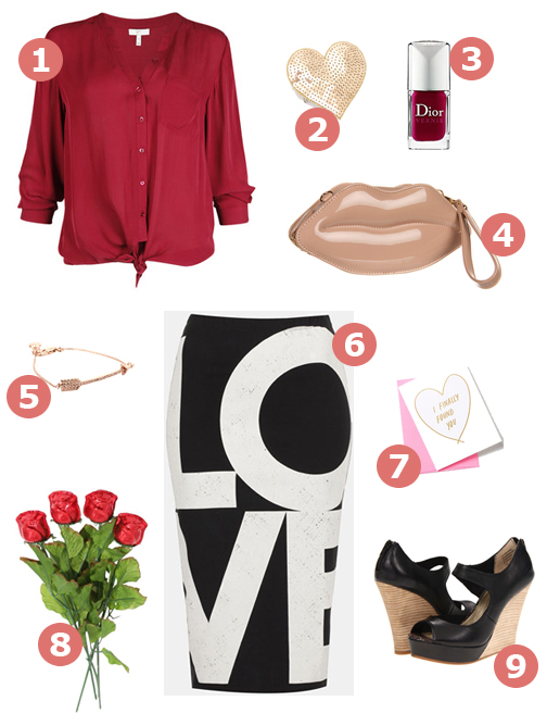1. Tie-front shirt (sold out, similar here); 2. Heart pin from Ban.do; 3. Dior red nail polish to coordinate with your top; 4. Lip clutch from Aldo; 5. Cupid’s arrow Juicy Couture bracelet; 6. Skirt from Topshop at Nordstrom; 7. “I Finally Found You” Valentine’s Day card from Anthropologie; 8. Chocolate roses for your love; and 9. Seychelles heals.