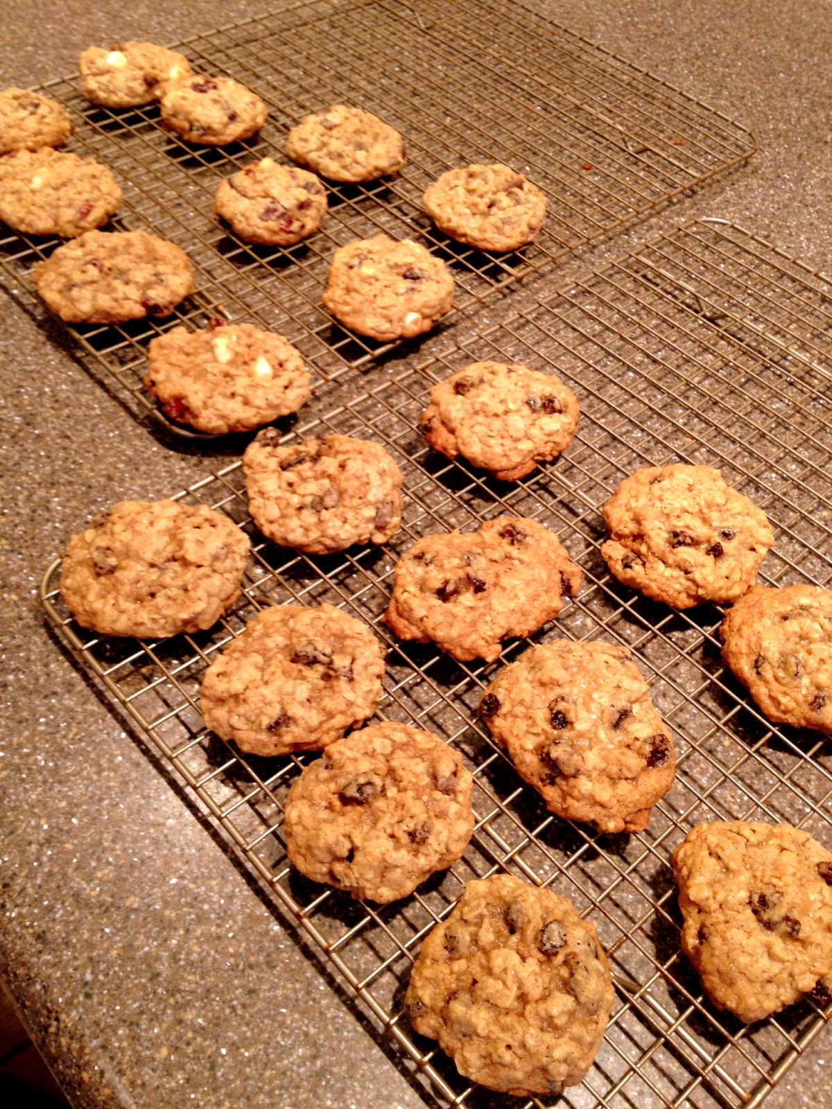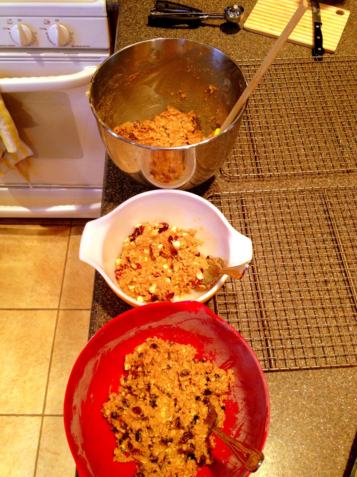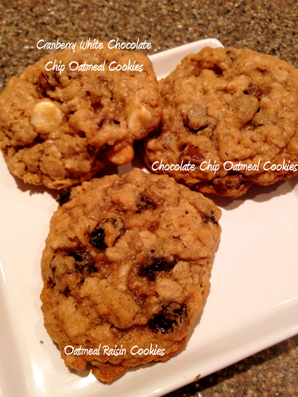 When snow storm Nemo had us house-bound over the weekend, we absolutely had to bake cookies.  We decided to make a full batch of oatmeal cookies 3 ways: traditional oatmeal raisin, chocolate chip oatmeal, and my favorite cranberry white chocolate chip oatmeal cookies.