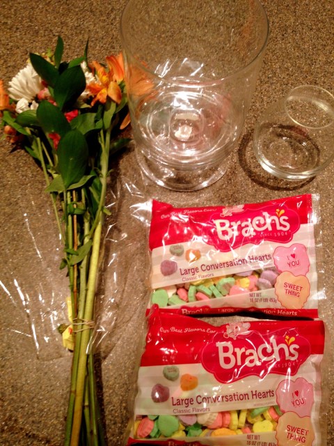 I thought it would be fun to make a Valentine’s Day centerpiece much like the one I made last Easter using conversation heart candy. I found the candy on sale 2/$6 and flowers for $4, not bad and so easy to put together: