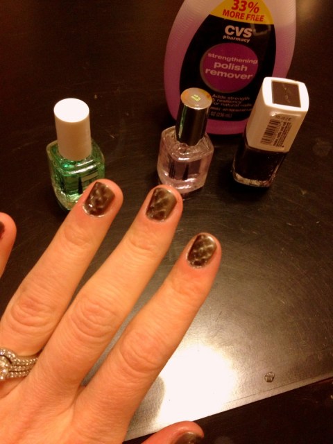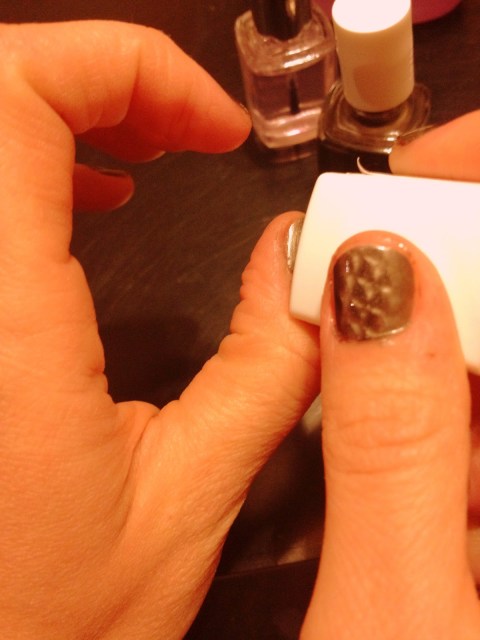 2. You should also sort of move it around the curve of your nail, otherwise just the top of your nail will get the pattern. I did my left hand first and that’s why my right hand came out much better.