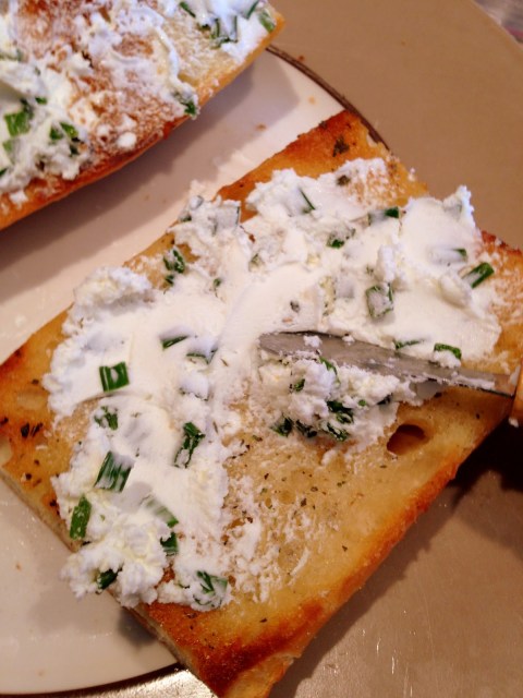 | Spread your goat cheese on the bread when it’s right off the grill. |