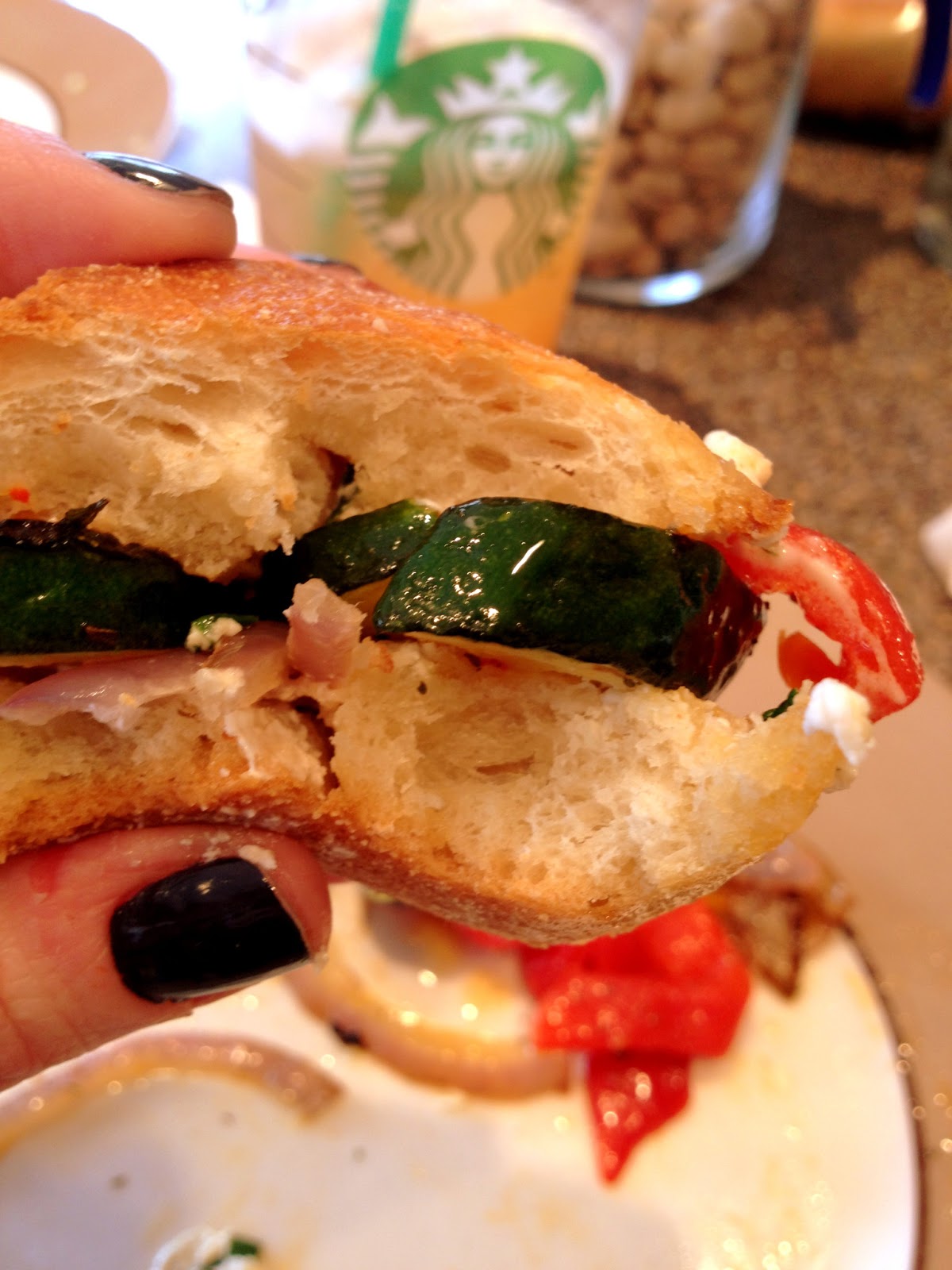 For lunch I usually eat something boring like a Lean Cuisine or turkey sandwich. The other day we had some leftover goat cheese that had to be used up and I recalled an episode of Giada at Home on Food Network where she made a delicious grilled vegetable sandwich with goat cheese spread on the bread. I made my own version of that and it was just spectacular – more indulgent than a low cal Lean Cuisine, but worth it!