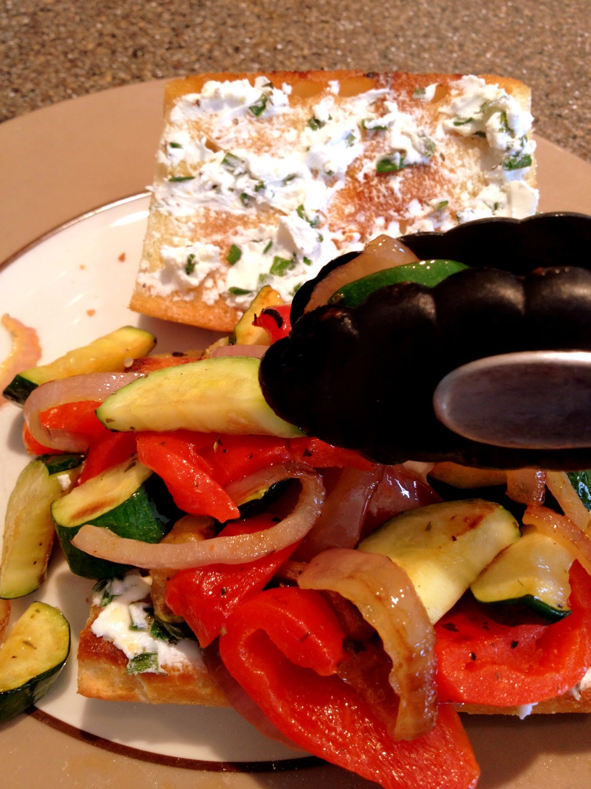 | Once veggies were almost done I added roasted red peppers. Grill your bread, too. |