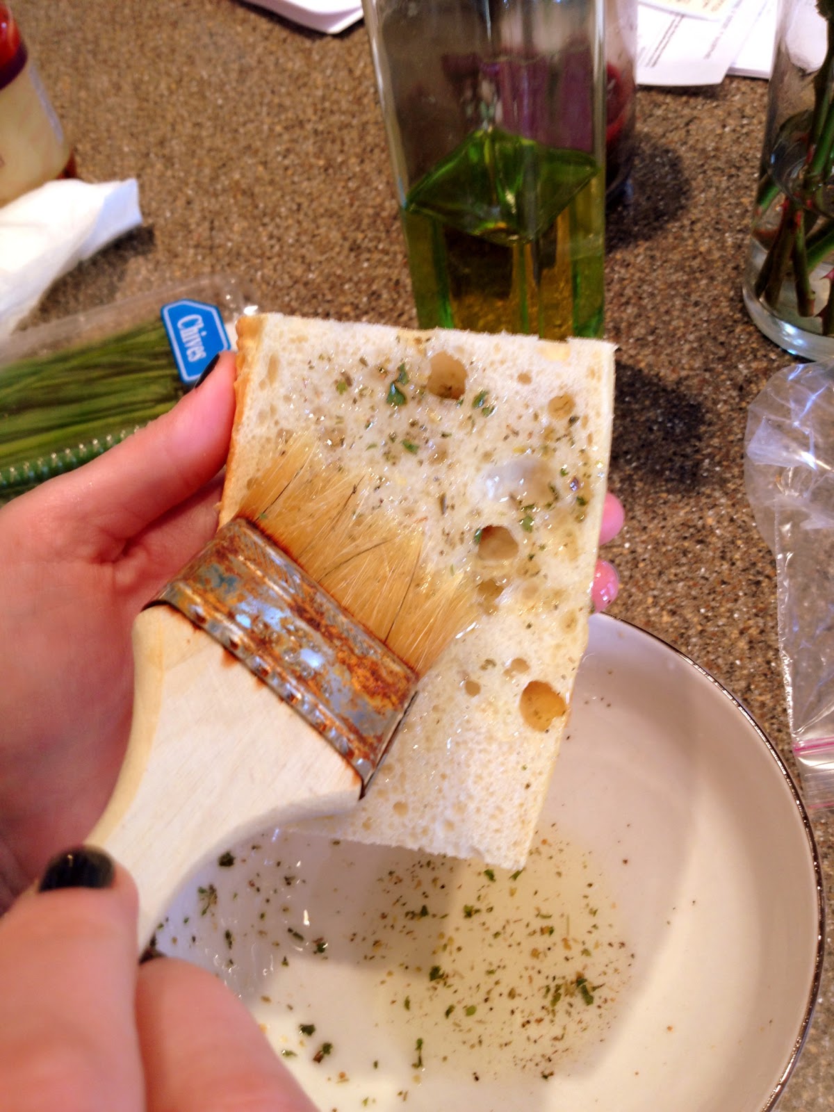 | Brush remaining seasoned oil on your bread, I used ciabatta. |
