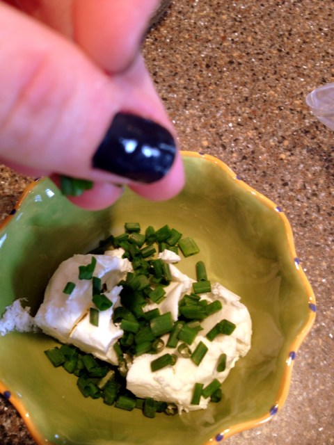 | Mix about 2 oz room temperature goat cheese with chopped chives. |