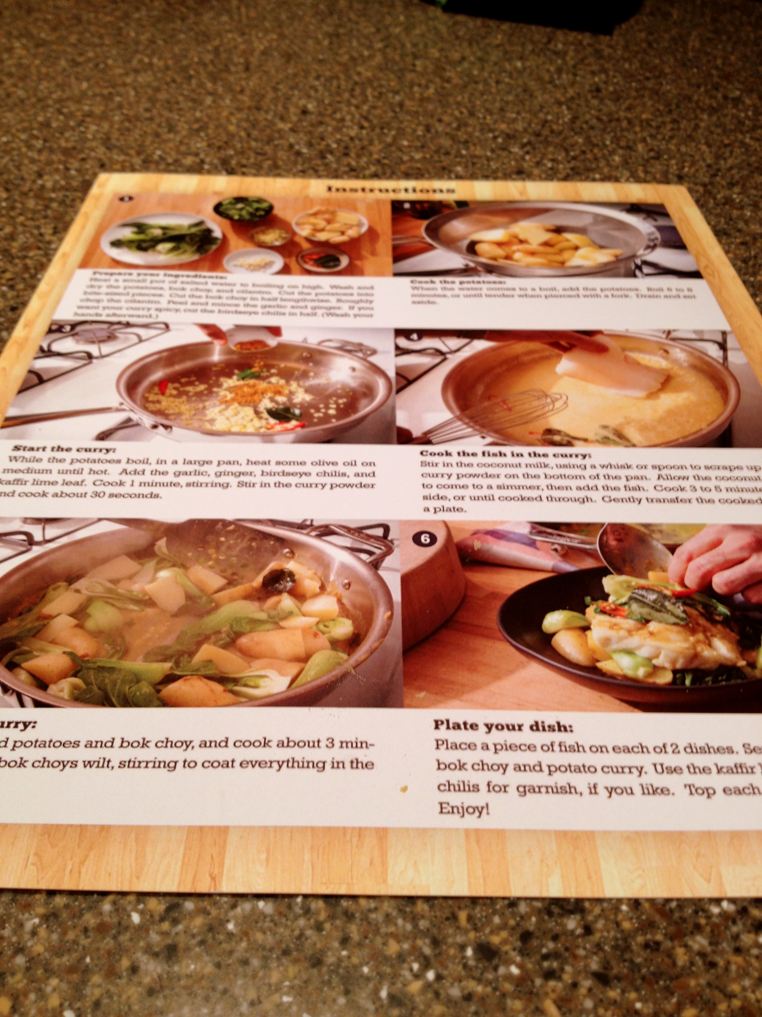 This is the Cod Coconut Curry with Baby Bok Choy and Yukon Gold Potatoes. Overall it was good – but it was very spicy and there was a lot of grittiness to the bok choy even though we thoroughly washed it.