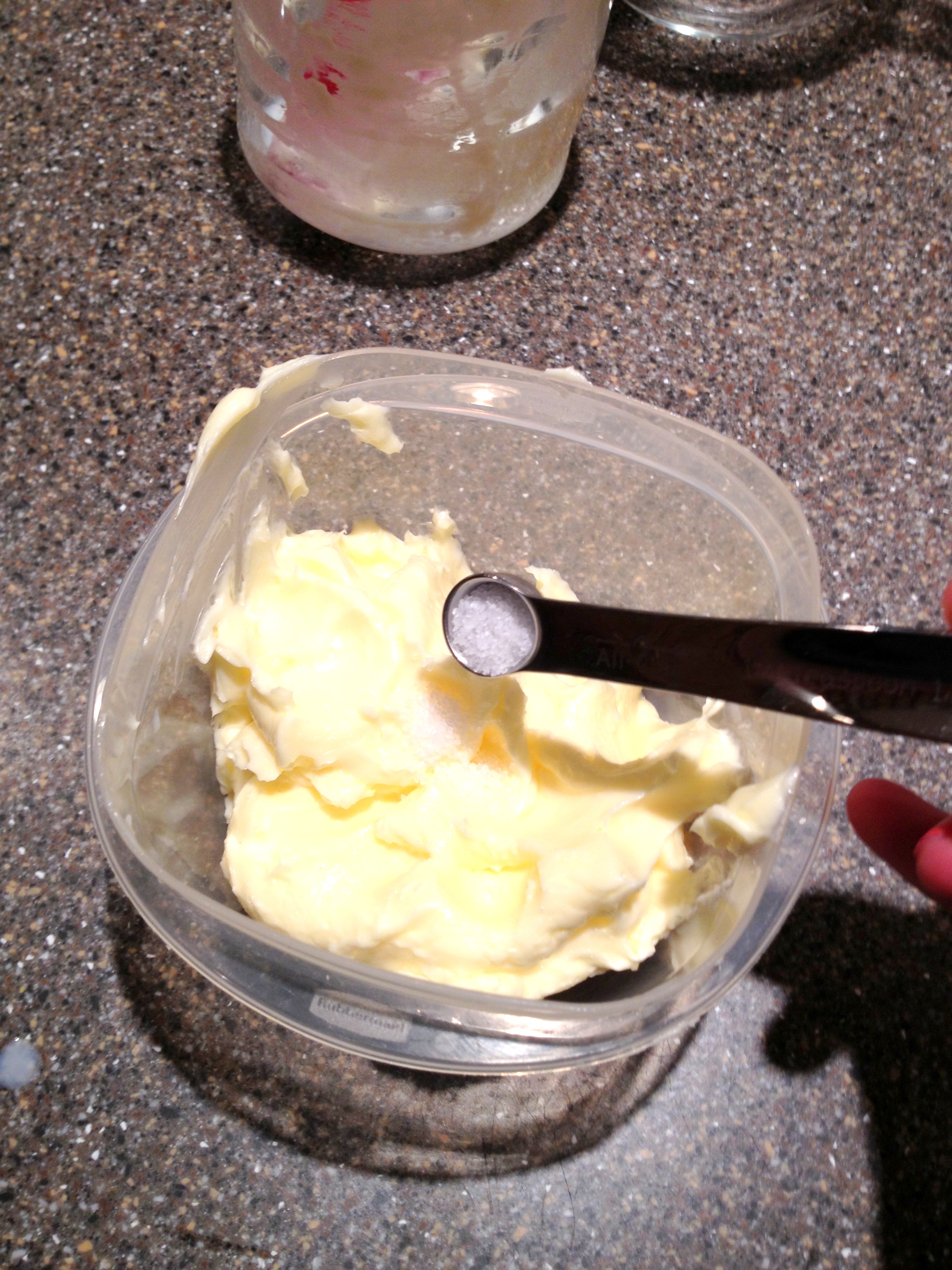 Once you feel as much of the buttermilk is squeezed out as you can get, put it into a tupperware container (or something similar) and add 1/2 tsp of salt and fold it in. *Note, at this point you could also fold in other herbs or seasonings to make a flavored butter. Cinnamon sugar, herbs de Provence…