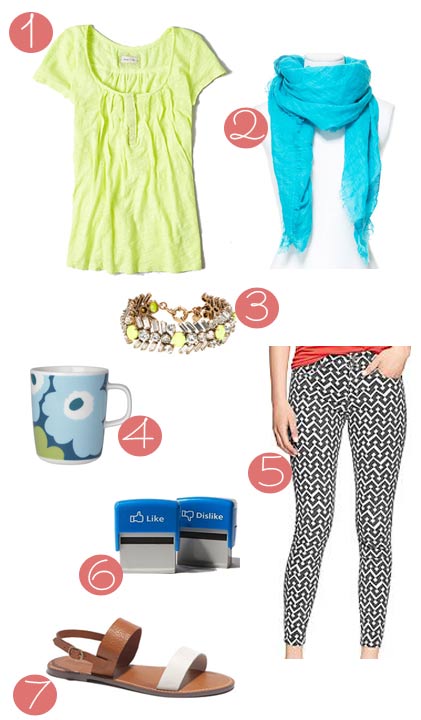 1. A comfy, stylish top that won’t wrinkle is key while you’re working all day, mostly sitting at a computer. I love this Centerstitch Tee in yellow from Anthropologie; 2. Dyed Linen Scarf with Contrasting Stripe from Zara in case your home office space is cold; 3. Working from home doesn’t mean you don’t need accessories – this J. Crew Crystal and Neon Chevron Bracelet would be great for this outfit; 4. Bottomless cup of delicious homemade coffee in a Marimekko Unikko Turquoise Mug from Crate & Barrel; 5. My work from home uniform usually includes a pair of skinny leg pants in a pattern or color. I love these black and white printed legging skimmer jeans from GAP; 6. Fun stamps from Urban Outfitters to keep yourself amused; and 7. I love these Slingback Boardwalk Sandals from Madewell, easy to throw on at the end of the day when I’m dashing out of the house to pick up Z at the end of my work day.