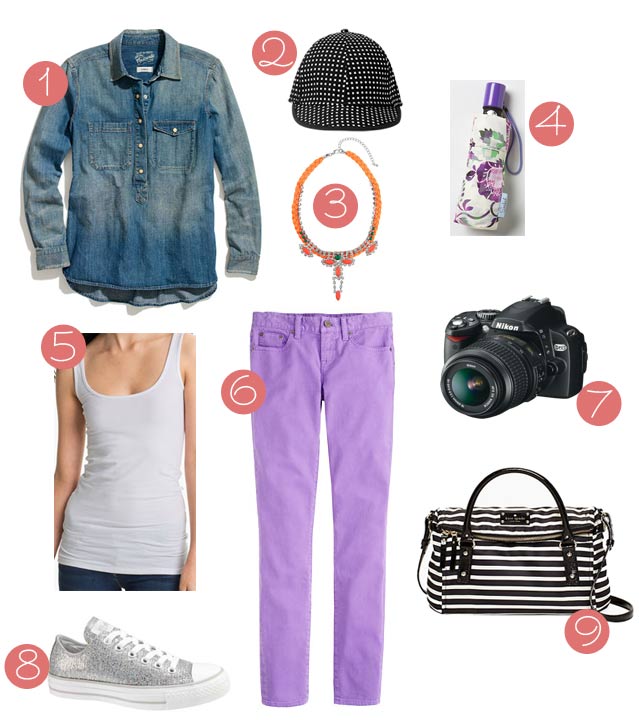 1. I am addicted to my chambray, similar to this from Madewell so I will absolutely be wearing it a lot on this trip; 2. A cute baseball cap from kate spade Saturday if it’s sunny and you need to protect your face; 3. A necklace because you still want to accessorize while you’re being a tourist! I love this one from Topshop for a pop of color; 4. You should always carry an umbrella in London, it might as well be cute like this one from Anthropologie; 5. A white tank for under my chambray – these BP double scoop neck tanks from Nordstrom are my fave; 6. I love a bright pant – and they look so great with chambray tops, especially in your vacay photos! I love these Toothpick jeans in Fresh Purple from J. Crew; 7. Our good camera – the Nikon D60 for all our photo taking; 8. ;My favorite Silver Sparkle Converse sneakers – the perfect urban sneaker for a gal who loves sparkle and comfort; and 9. A crossbody bag to hold all your stuff and wear comfortably all day. I have one the same shape and size as this kate spade bag and it’s perfect for travel.