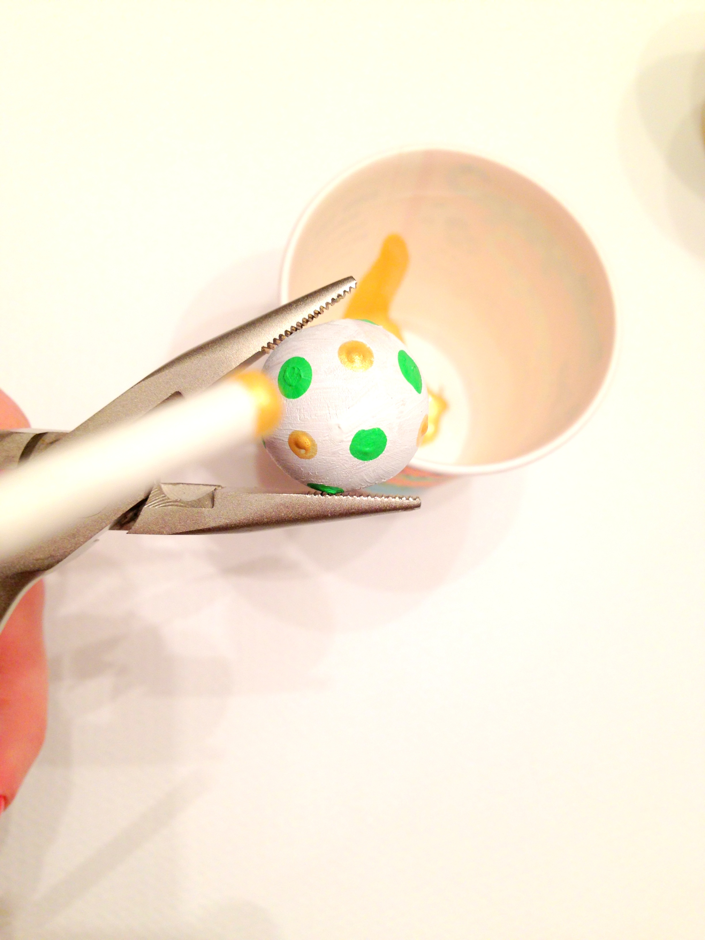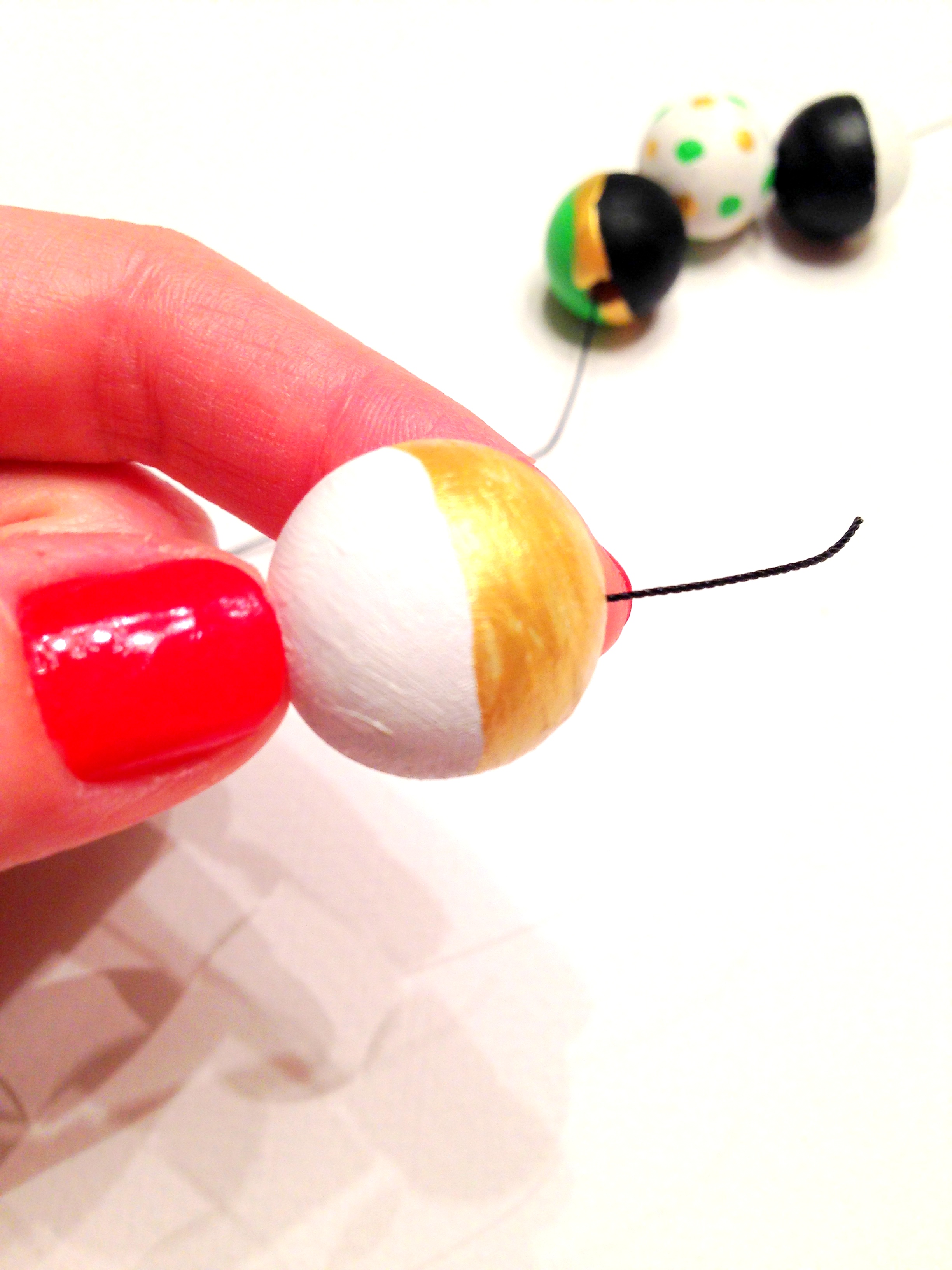 First – paint your beads! I went with a color scheme of white, black, green, and gold. It’s best to paint your base coat first then let dry completely.