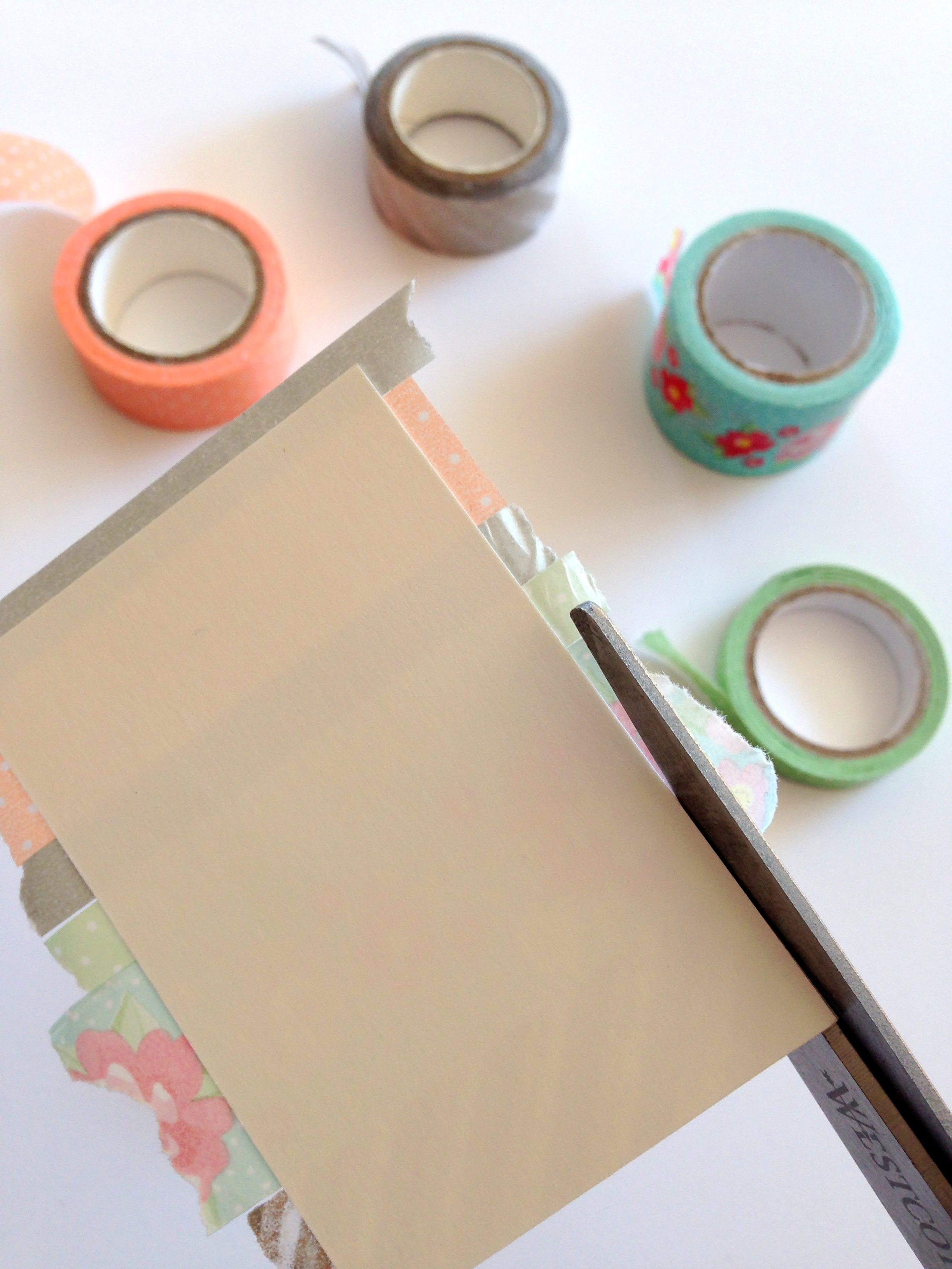 Cover the back with double sided tape (or a glue stick would work here, too) and stick to your washi tape-covered card.