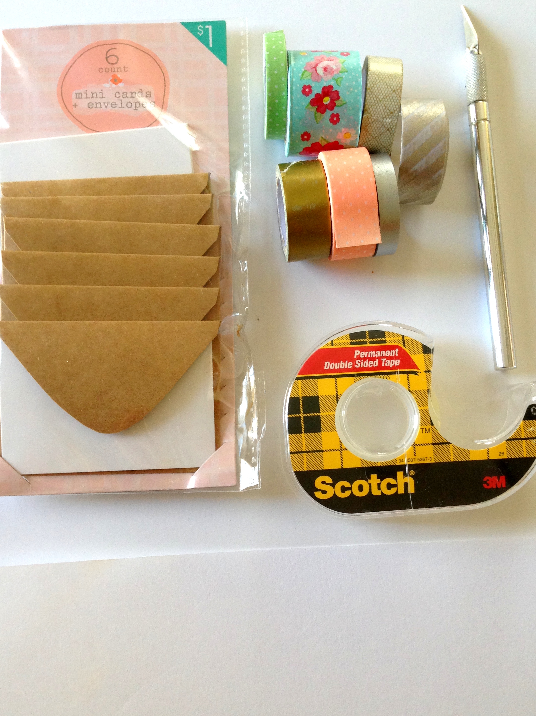 You will need: Blank cards (I used cute, tiny cards from the Target dollar section), washi tape, double sided tape, an x-acto knife, white paper, and scissors (not shown).
