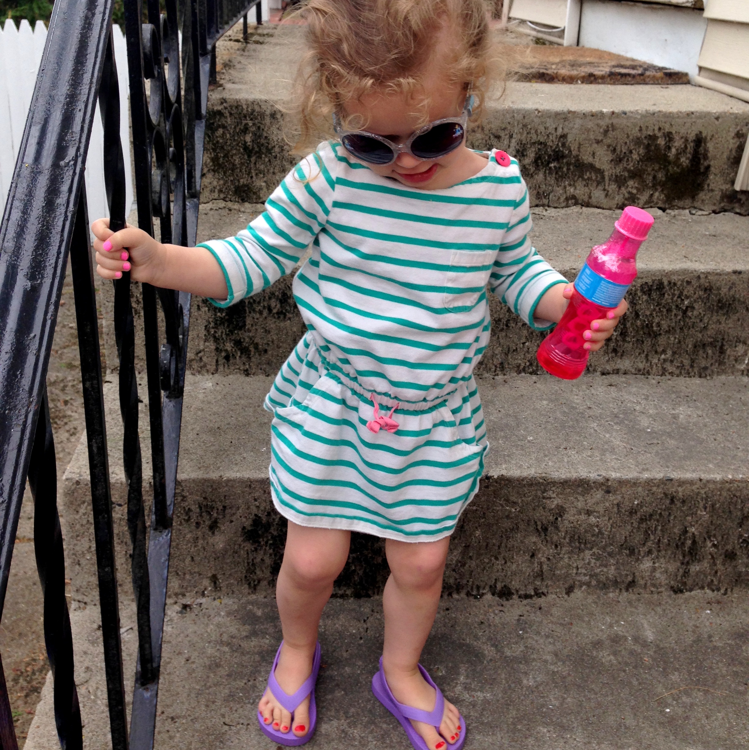She looks girly with her fresh mani/pedi, dress, pink bubbles, and giant sunnies – but she headed out back for hours of playing in sand and dirt and grass in the backyard.