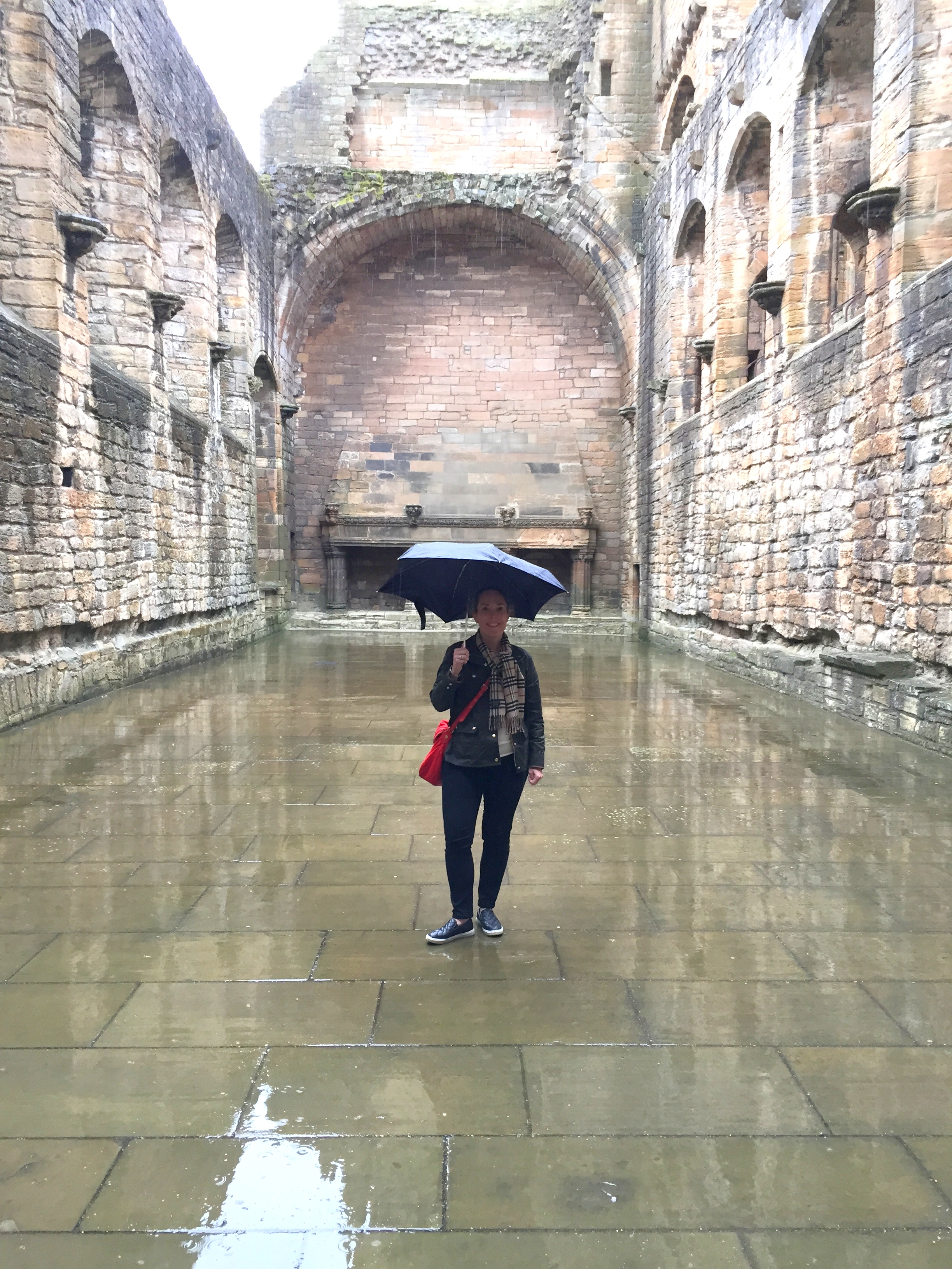 We decided to rent a car so that we’d have time to do some touristy things and see more of Scotland before the events of the wedding began. Friday we drove to tour Linlithgow Palace famed for being the castle where Mary Queen of Scots was born. It was amazing and HUGE! As with many castles in Scotland it was burned in a fire but the skeleton of the castle remains for us to see. In the first photo above I am standing in the Great Hall of the castle holding an umbrella because there isn’t a roof anymore. It was raining but just lightly and I always think a light rain is fitting for Scotland, no?