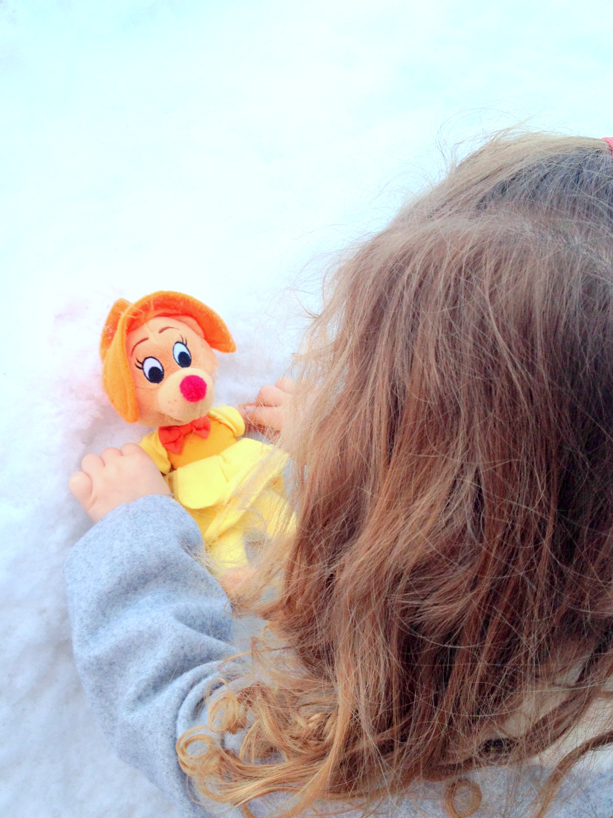 Almost every time we leave the house this stuffed mouse does a snow angel in our giant snow bank.
