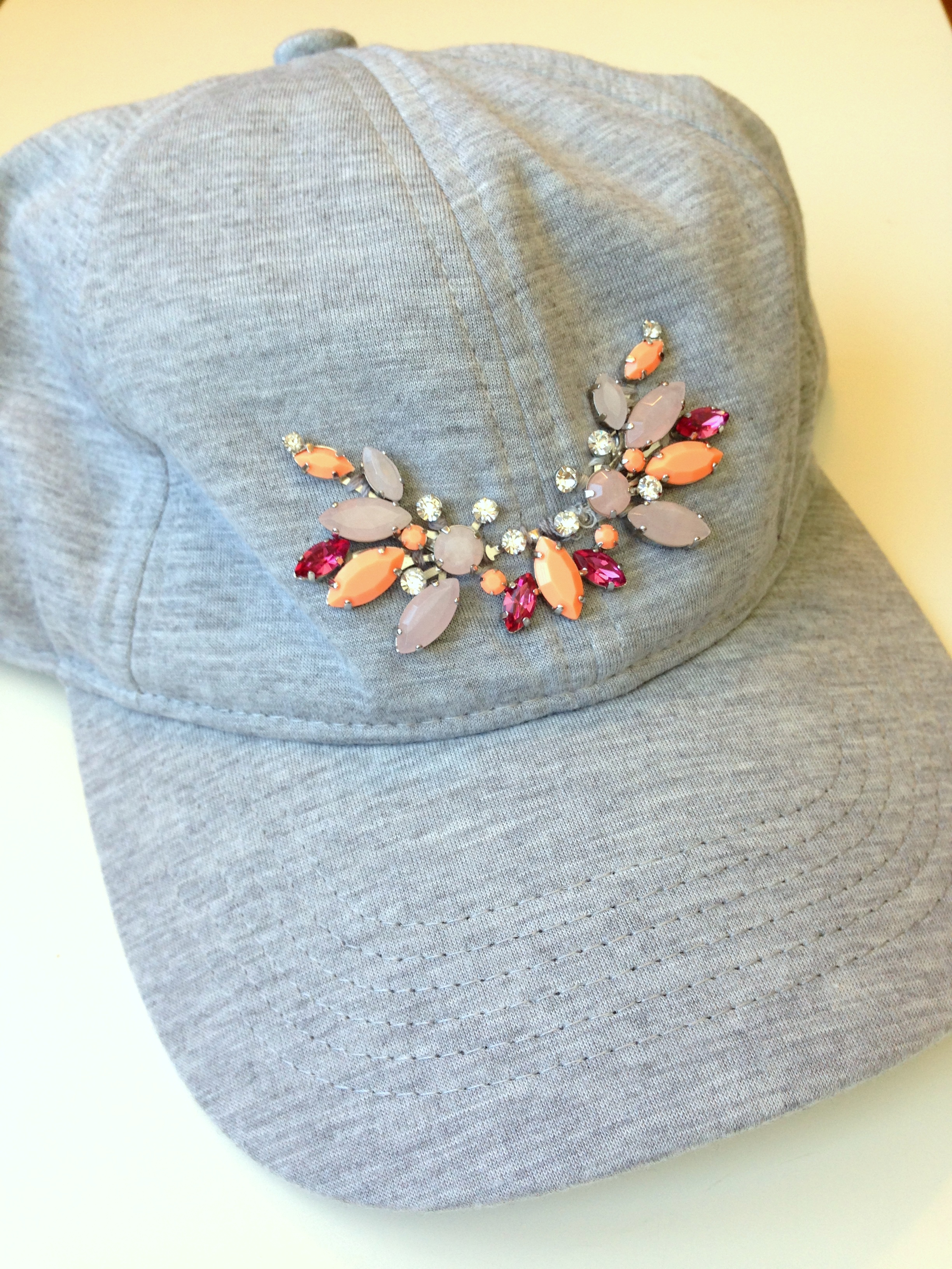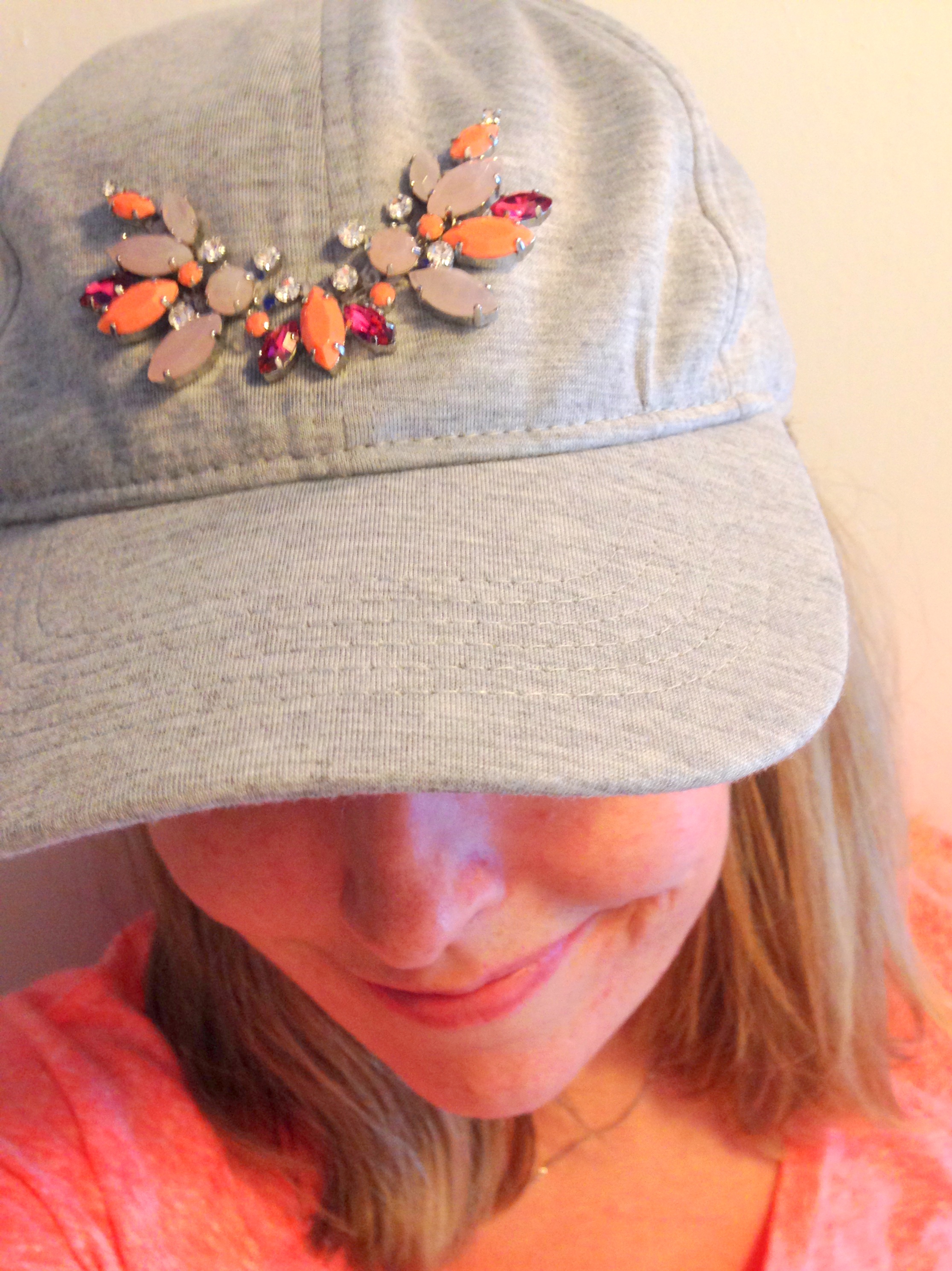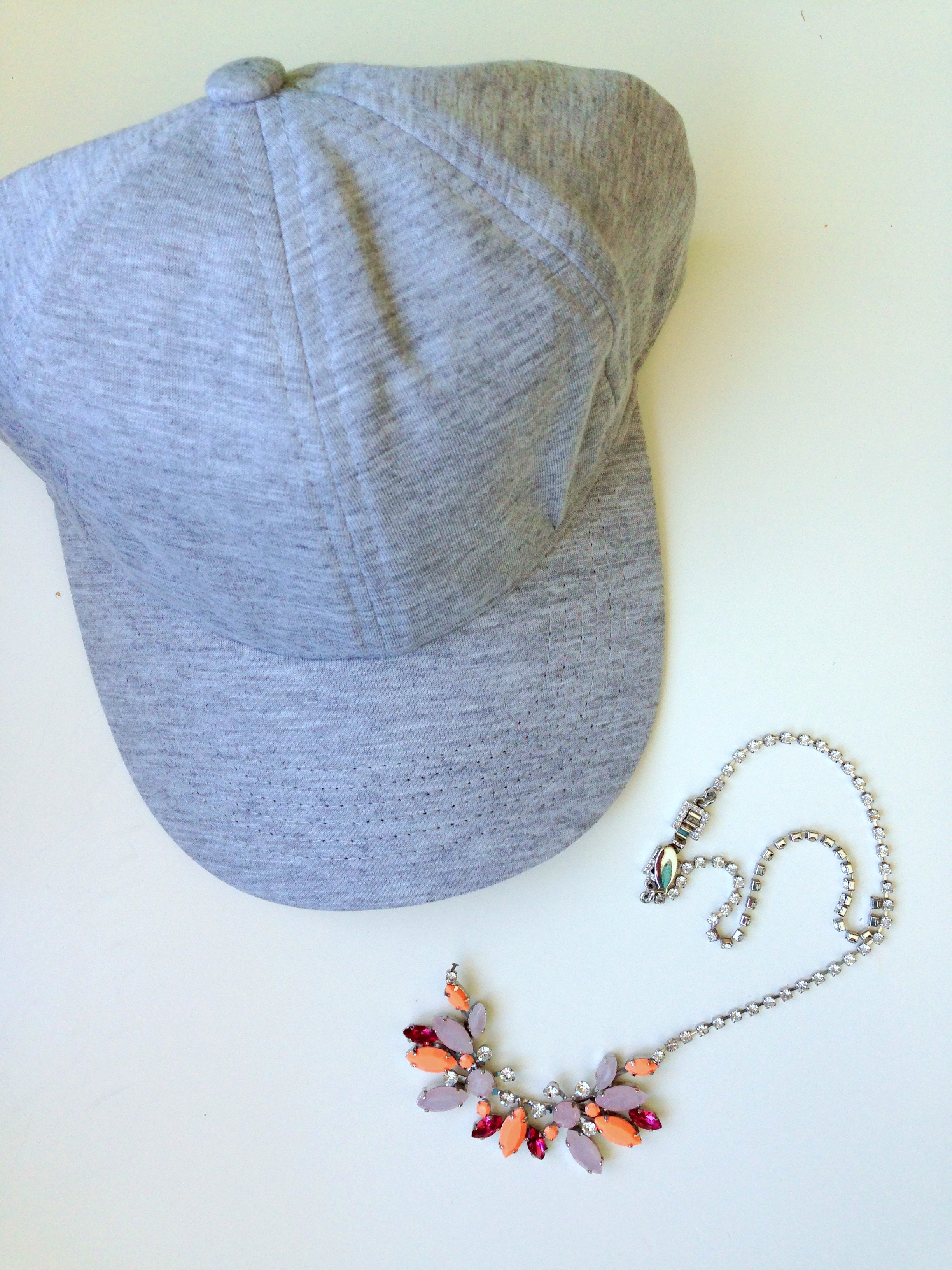 Ever have a broken statement necklace that is beyond repair and looking to do something with it? DIY embellished baseball cap, my friends! I’ve had this necklace from Ann Taylor for years and wore it with a million different things until one day it snapped – the necklace part was quite thin silver with more faux diamond jewels on it so I wasn’t too surprised when it just fell apart. But I love the beaded area with the coral, pink, and lilac gems and didn’t want to just toss the whole thing. Then I kept seeing caps like this and this while I was out and about and a light-bulb went off – embellish a baseball cap with the broken necklace!