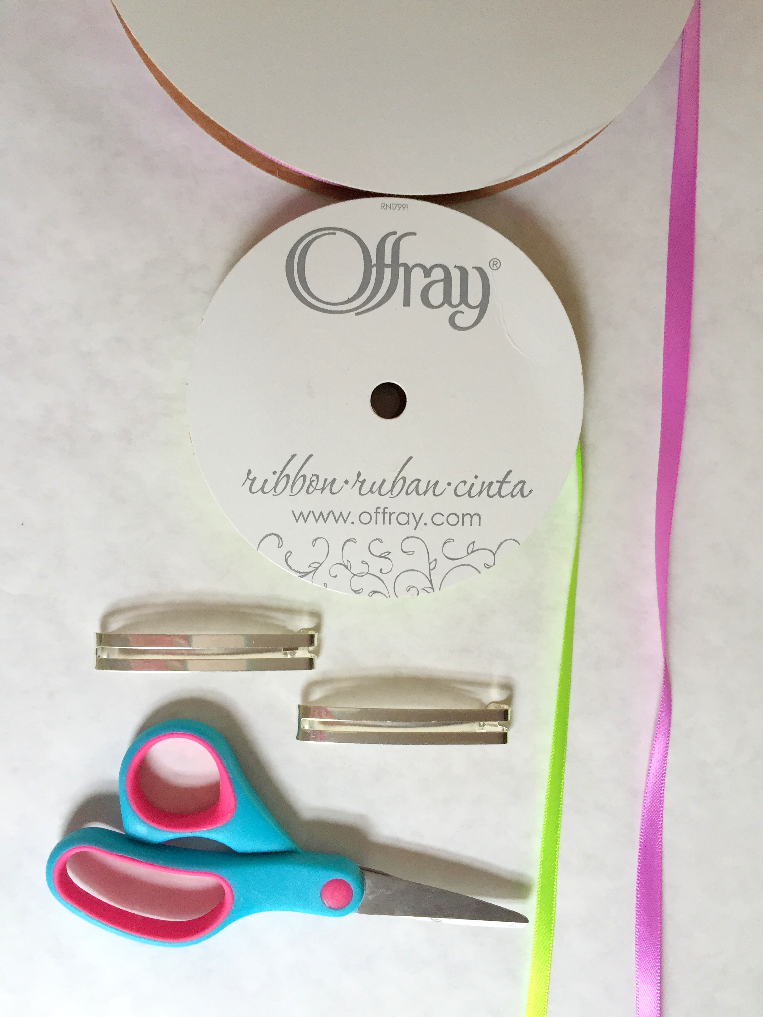 To make this ribbon hair accessory you will need: about 2 feet of 2 colors of 1/4″ or less width ribbon, scissors, barrettes with an open center, I bought these on Amazon.