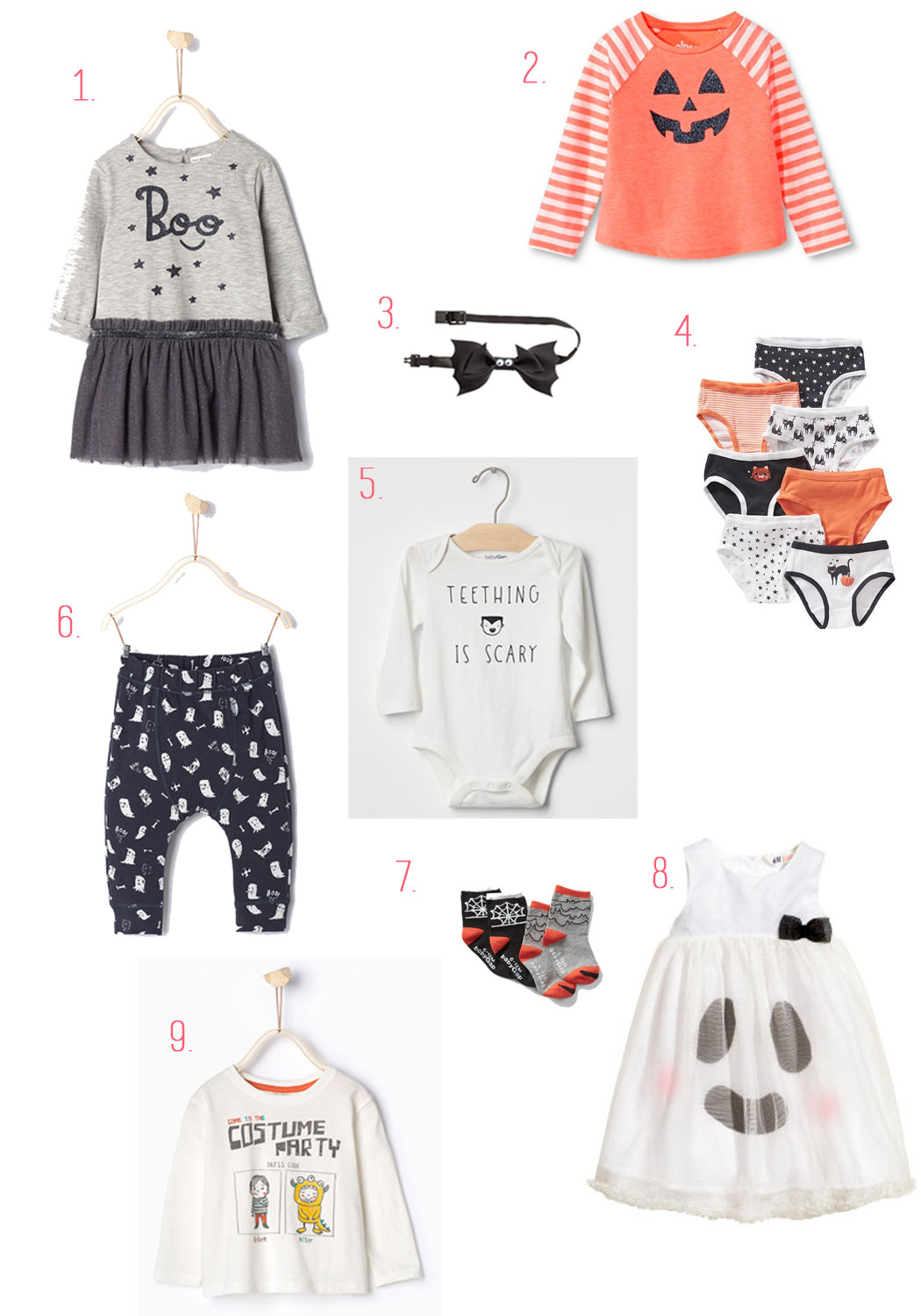 1. Zara Boo dress (Zara has tons of adorable, non-traditional Halloween clothes for kids, check out the whole line!) 2. Target neon orange pumpkin shirt 3. H&M Bat bow tie 4. Old Navy Halloween undies 5. GAP onesie (teething is scary especially when it wakes your baby up at 5am every day for a month…eeeeeek!) 6. Zara ghost pants 7. GAP Halloween socks 8. H&M ghost dress 9. Zara costume party top
