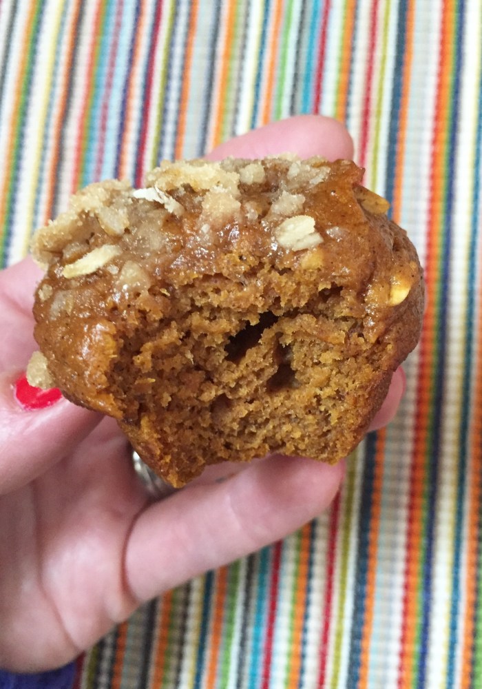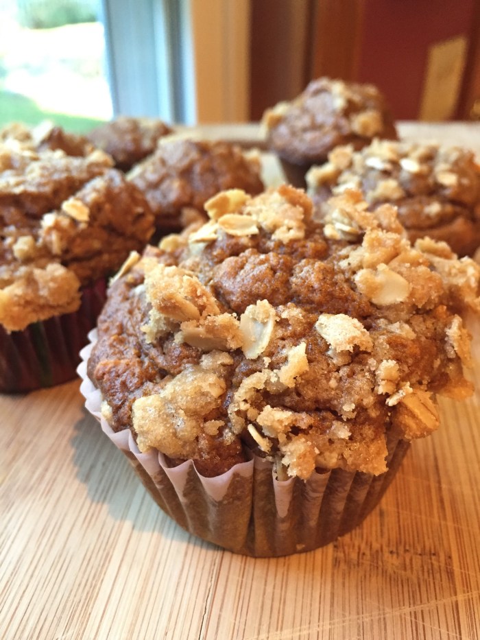 – the recipe calls for 2/3C oil and 1/2C apple sauce (1 1/6C together). I used about 3/4C apple sauce and the rest in oil to lessen the amount of oil used even more.- for the streusel topping, I mixed the flower, oats, and sugar with cold butter and blended together with my fingers before sprinkling on top of the muffins.
