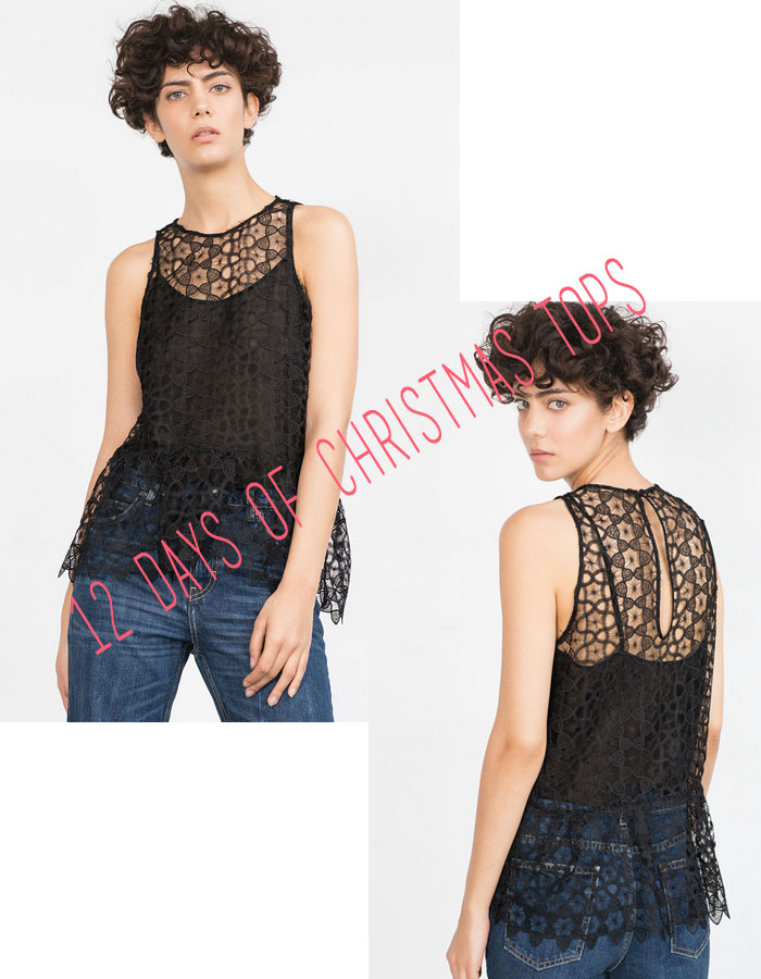 12 Days of Christmas Tops, day 4: This Lace peplum top from Zara is sort of the lace top of all lace tops (and I searched a TON of lace tops). The goal of a modern lace top is to look delicate without being matronly – and this is honestly the edgiest lace top I’ve ever seen, love it. With a black pencil skit and heals you’d be wearing a pretty killer Christmas outfit.