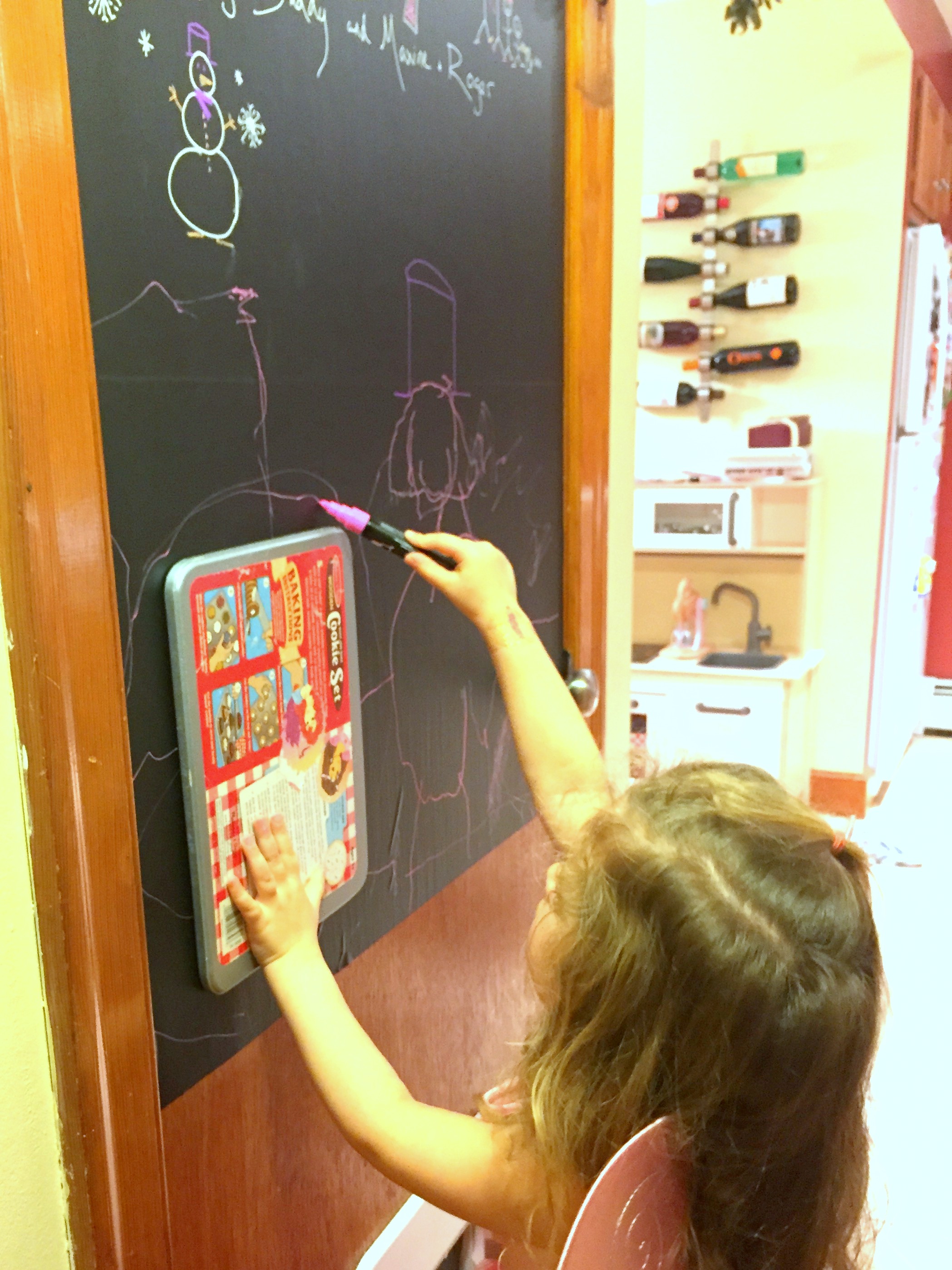 She and I are both obsessed with our new chalkboard pens and chalkboard strip on the basement door.
