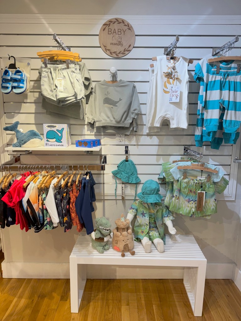 I refreshed the Baby Boy corner last week and I love how it came out – showcasing the adorable, tiny bathing suits and water shoes (of which we don’t have many left) complimented by some adorable summer outfits that we still have some inventory. The MOLO button down, shorts, matching tee, and sun hat needed to be showcased on a mannequin to highlight the need to purchase all 4 pieces to complete the look. And he looks adorable with his Jellycat sand castle stuffy, right?! Happy Shopping!